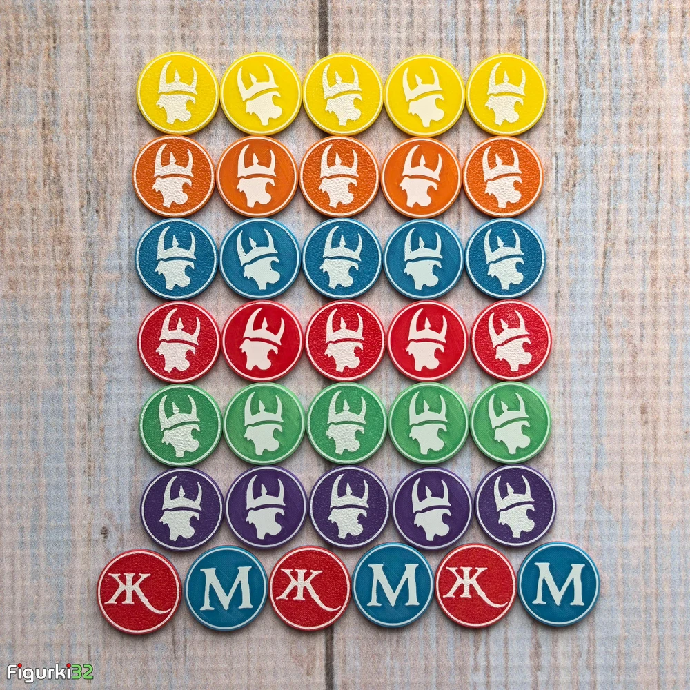На других жетонах с одной стороны нанесена буква Ж на красном фоне, с другой стороны нанесена буква М на синем фоне. Они используются для отслеживания пола вашего персонажа в игре.