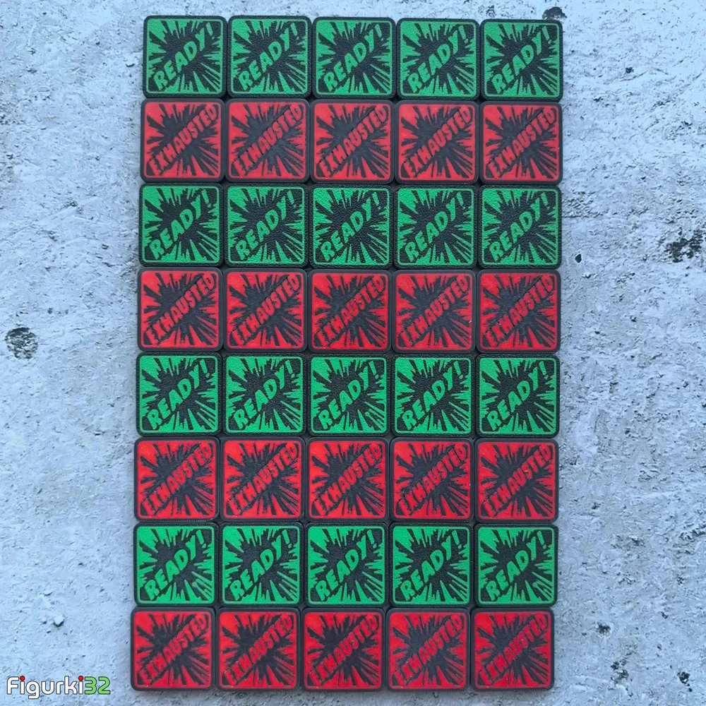 Двусторонние жетоны состояний Ready / Exhausted из прочного ABS-пластика, выполненные методом многоцветной 3D-печати.