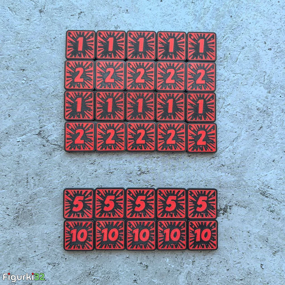 Пластиковые жетоны урона разных номиналов для удобного и наглядного подсчёта повреждений в Marvel Champions: The Card Game